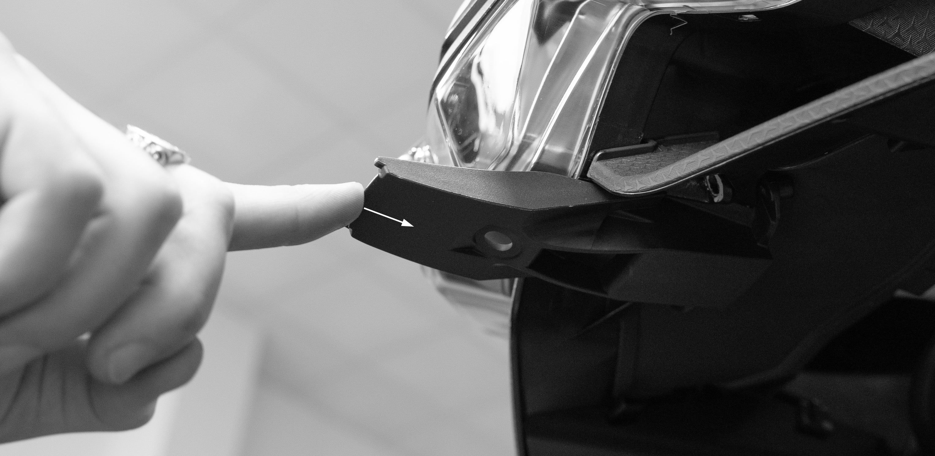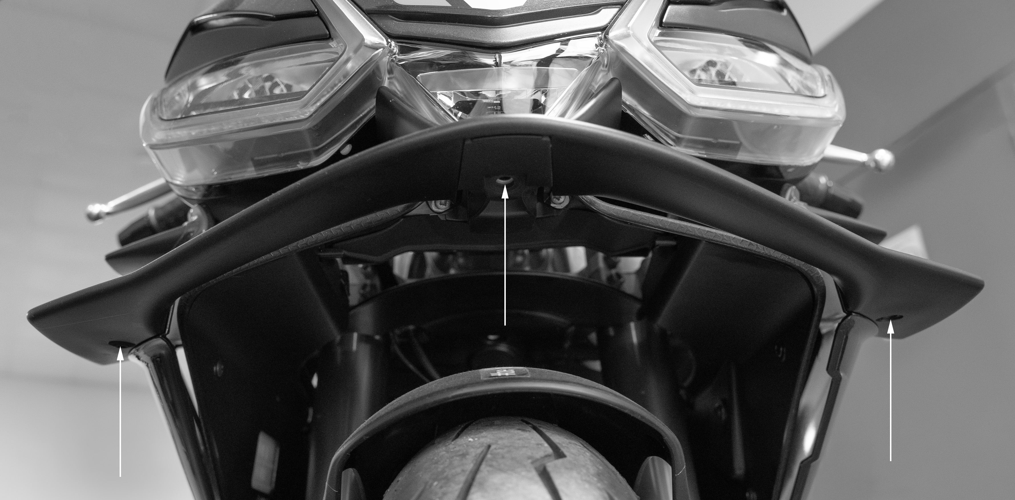 Step 1 : Remove the two plastic clips that hold the fairings together under the headlight. You can use a flat screwdriver if needed. Then, using the supplied Torx Allen key, unscrew the two side fairing screws as shown in the image. Perform this operation on both sides.