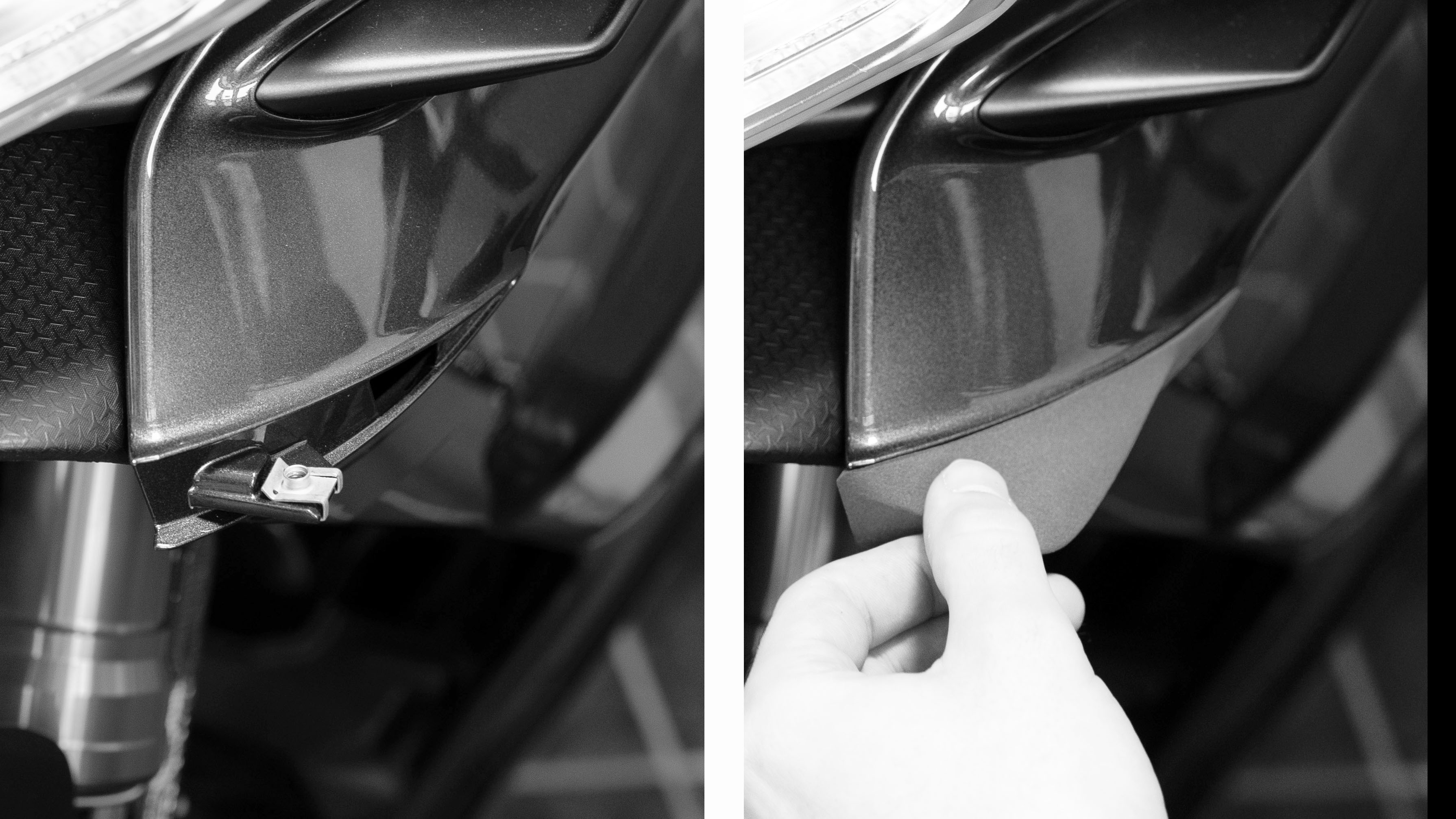 Étape 1 : Retirer les deux clips en plastique qui maintiennent les carénages ensemble sous le phare de la Moto. Vous pouvez-vous aider d’un tournevis plat si vous avez du mal avec le doigt. Ensuite, à l’aide de la clé Allen Torx fournie dévisser les deux vis des carénages latéraux comme montré à l’image. Effectuer l’opération des deux côté.