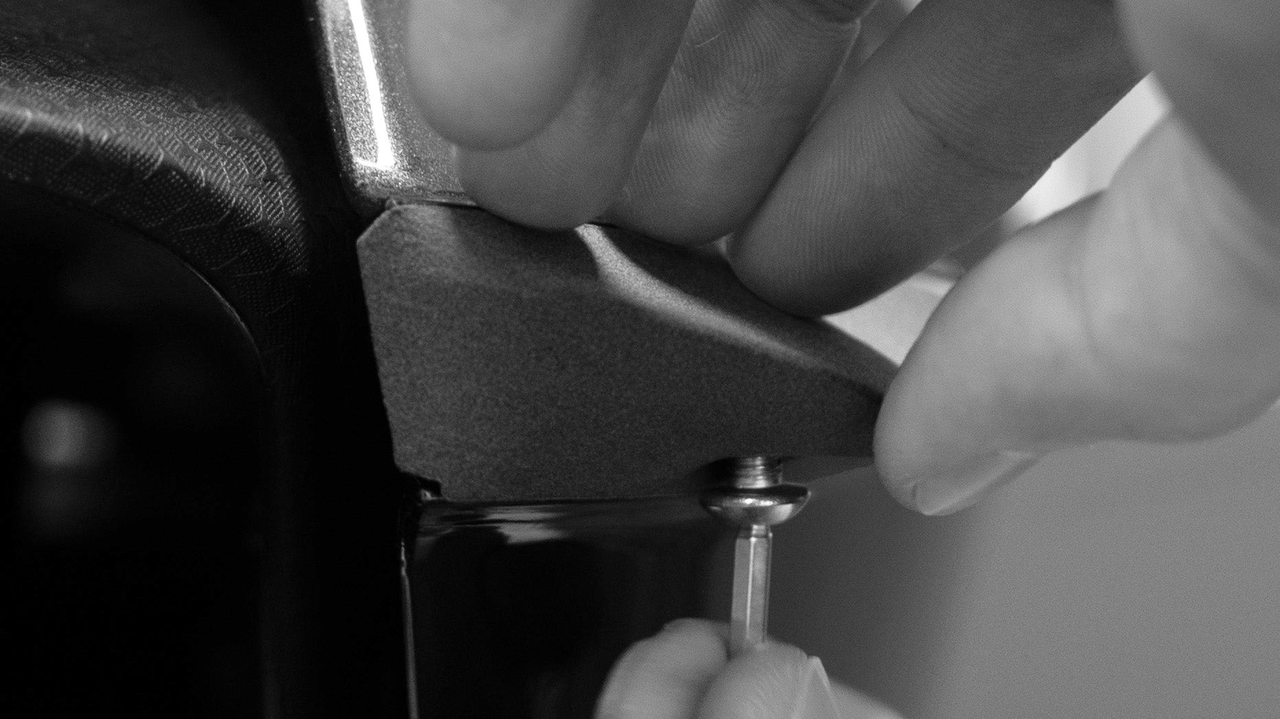 Step 3 : Insert the M4 nuts into the side support brackets. Assemble these with the half-wings using the supplied M4 screws and 2.5 mm Allen key. Don’t hesitate to slightly shift the upper cover to allow for easier screwing; it is flexible and won’t break.